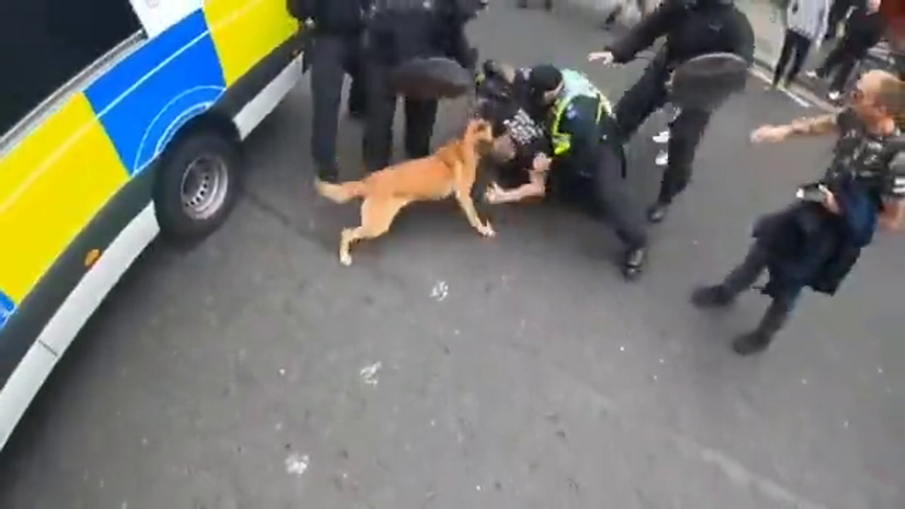 Pigs set Dog on Downed Protester. Looks like the UK...