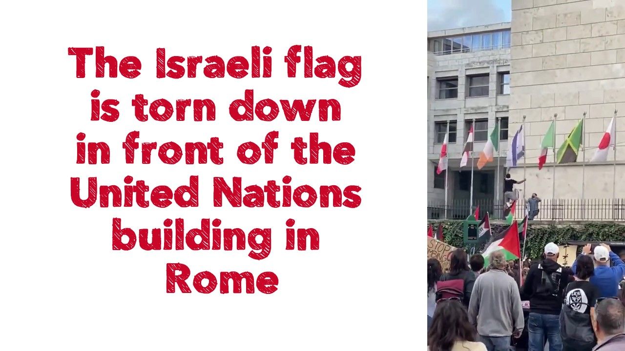 The Israeli flag is torn down in front of the United Nations building in Rome