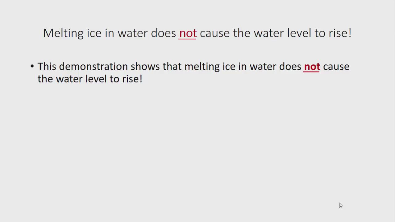 This demonstration shows that melting ice water does NOT cause the water level to rise!