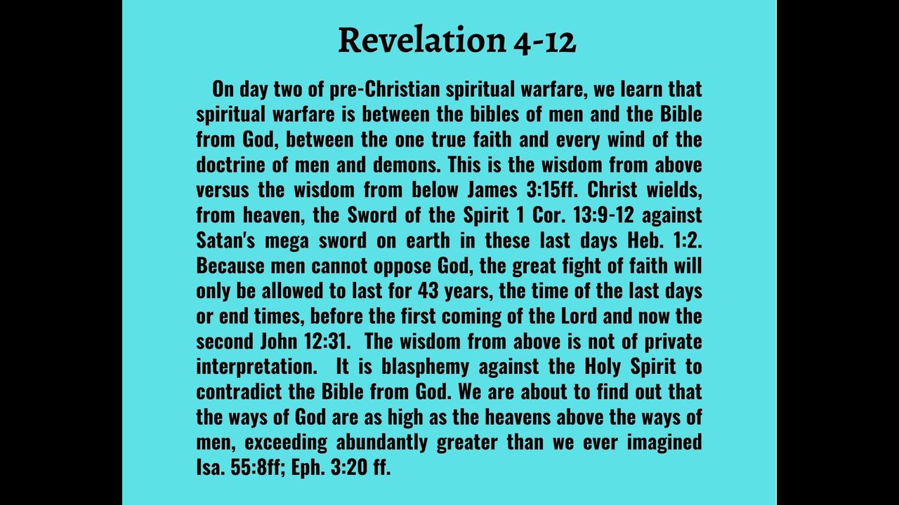 From heaven, Christ is again wielding the Sword of the Spirit, the wisdom from above in these last days or end times of the wisdom from below which is 43 years of the fight of faith between the second age of the one true faith Christianity and every wind of the doctrine of men Judas vs. 3; Heb. 1:2; 1 Cor. 13:9-12; Micah 7:15; Rev. 5:1ff; Dan. 12:4; Joel 2; Acts 17:-21; Rev. 6:4, etc.