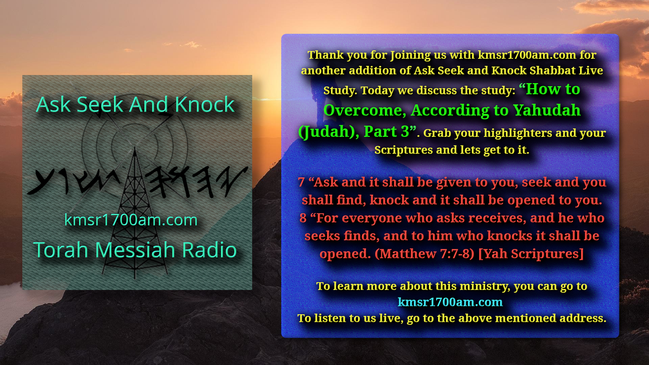 Thank you for Joining us with kmsr1700am.com for another addition of Ask Seek and Knock Shabbat Live Study. We were not so live this time, as our internet was down. Today we discuss “How to Overcome, According to Yahudah (Judah), Part 3”. Grab your highlighters and your Scriptures and lets get to it.