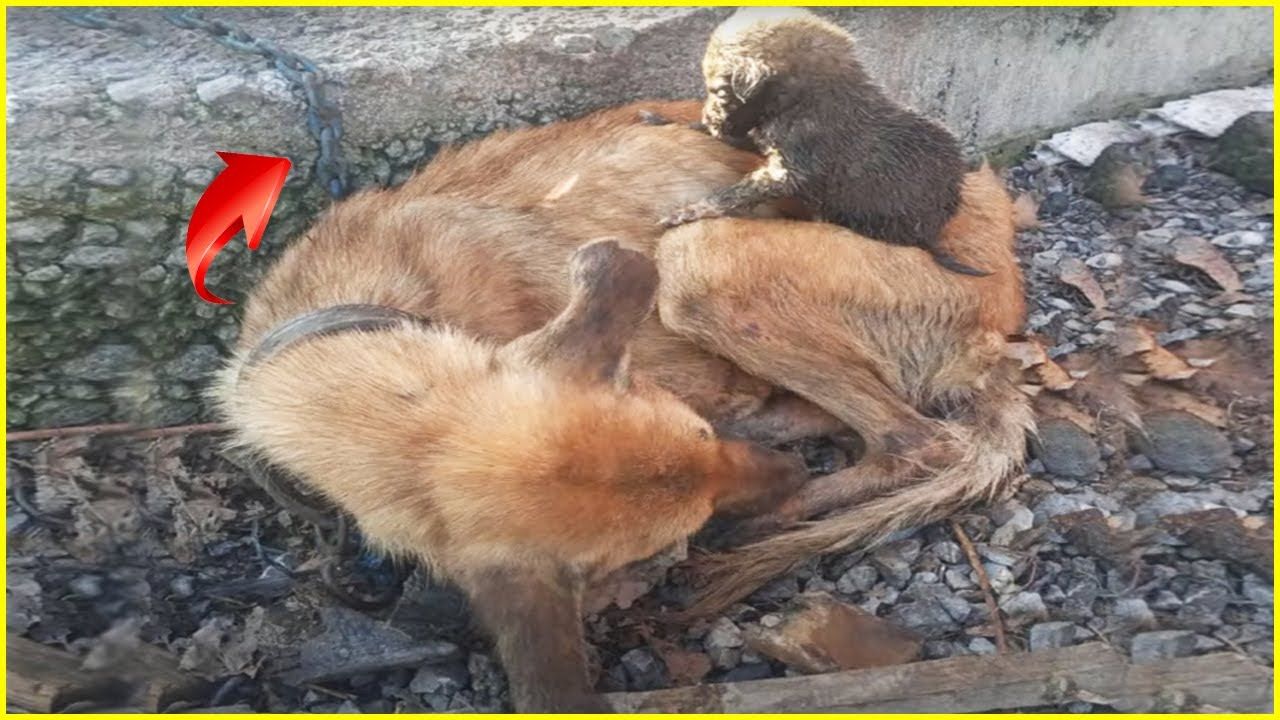 The exhausted mother dog still tried to protect her babies before she passed away. They were found on the side of the road in a very bad condition. It's worth mentioning that someone has chained the mother dog here. She couldn't move to find food, water or shelter.