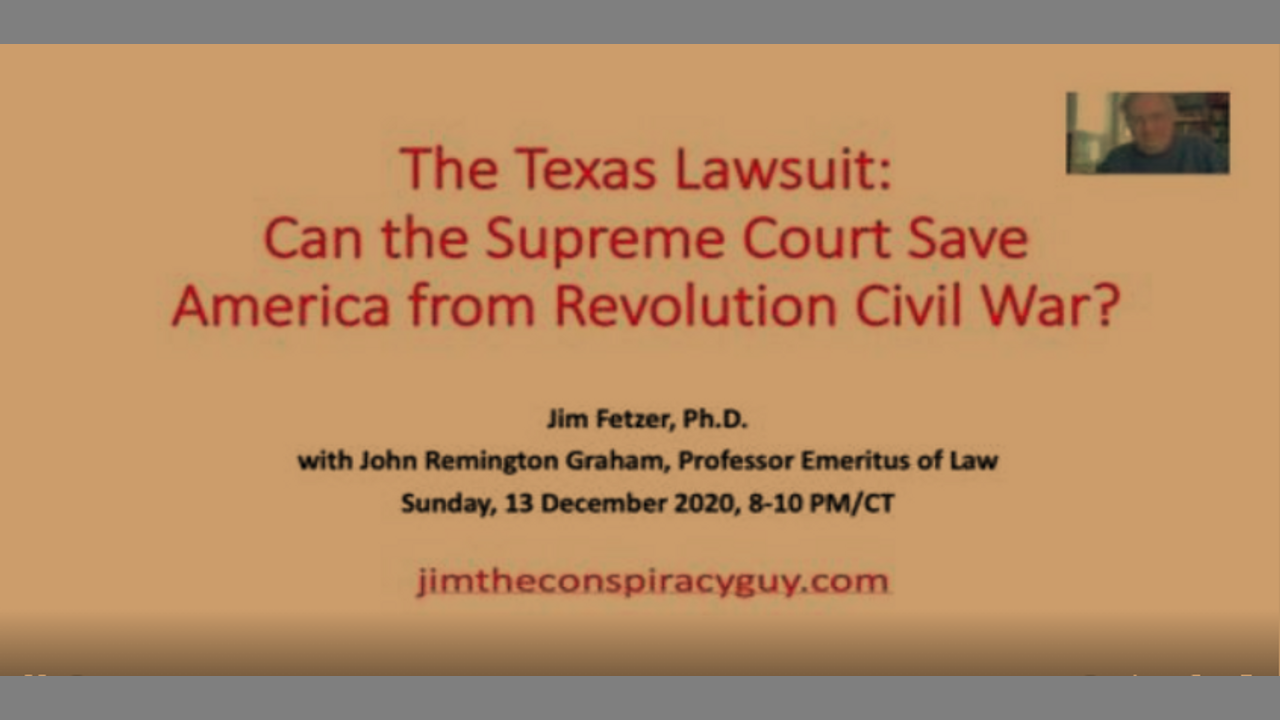 John Remington Graham on the future of the nation. A thorough and detailed review of the Texas lawsuit submitted to but rejected by SCOTUS, in what may have been a replication of the events that led to the (first) American Civil War, where I personally no longer believe the judicial system can save the United States from the consequences of the open and massive theft of the 2020 election to install Joe Biden and Kamala Harris, where their inauguration on 20 January 2021 will serve as the trigger for an uprising against the dark forces that are controlling the news services, the tech giants and the social media and depriving Americans of their freedom of speech and freedom of the press, which has built up to a violent revolution over the decades.