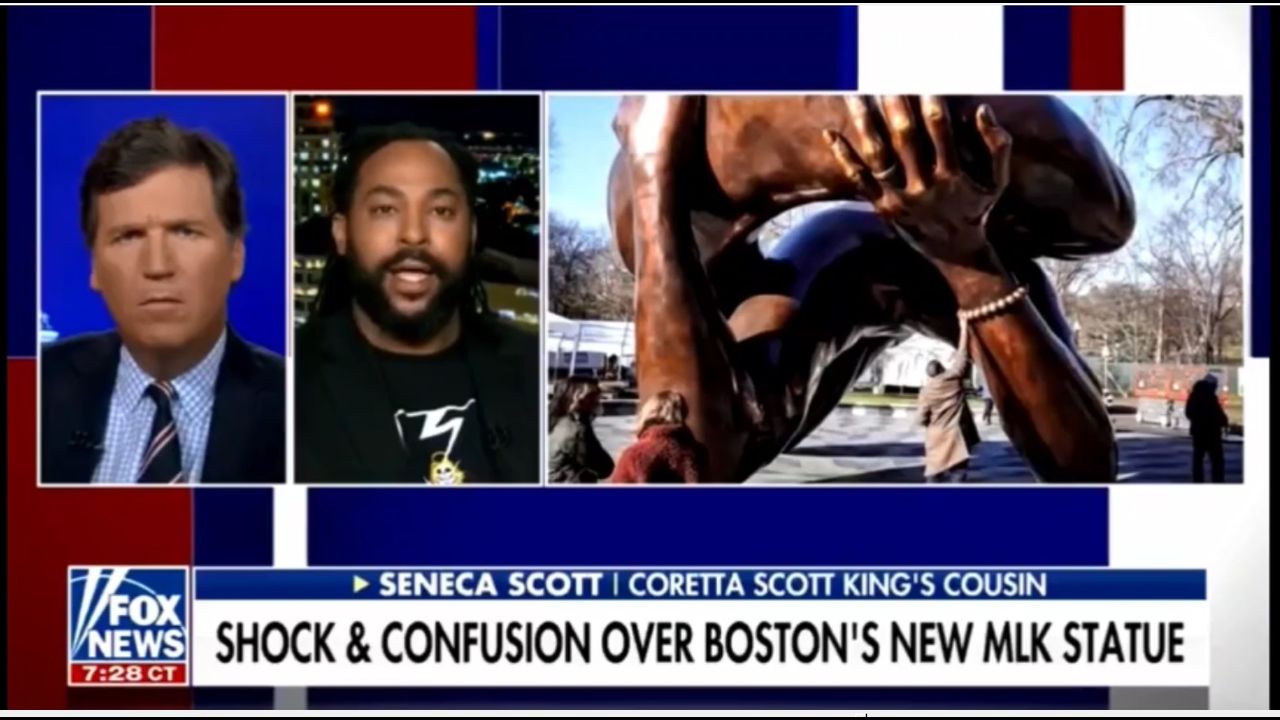 Seneca Scott with Tucker Carlson: "It's pretty much a consensus that this statue is a monstrosity and an insult to the family.""MLK was assassinated by the U.S. Government...."