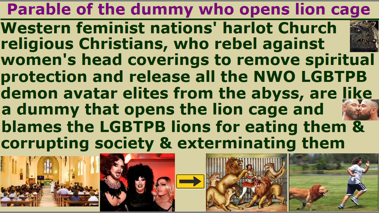 “The parable of the dummy who opens the lion cage”: Western feminist nations' harlot Church religious Christians, who rebel against women's head coverings to remove spiritual protection and release all the NWO LGBTPB demon avatar elites from the abyss, are like a dummy that opens the lion cage and blames the LGBTPB lions for eating them & corrupting society & exterminating them.