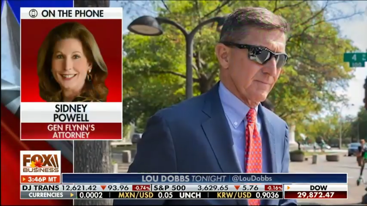"Sidney Powell, the attorney for former national security adviser Michael Flynn, appears on 'Lou Dobbs Tonight' to react to the news that President Trump pardoned Flynn."