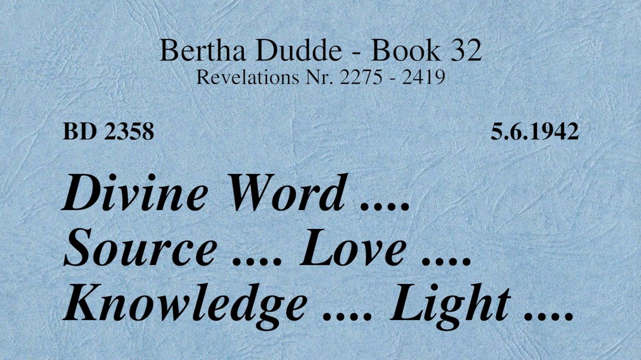 With these words the revelations of God to Bertha Dudde began on June 15, 1937, which found the conclusion on August 17, 1965 with the manifestation 9030 as a seal.
