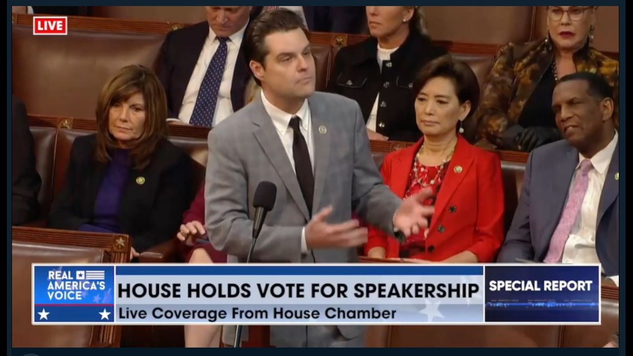 Ahead of the twelfth vote on the House floor, Florida Republican Matt Gaetz nominates Rep. Jim Jordan for House speaker.