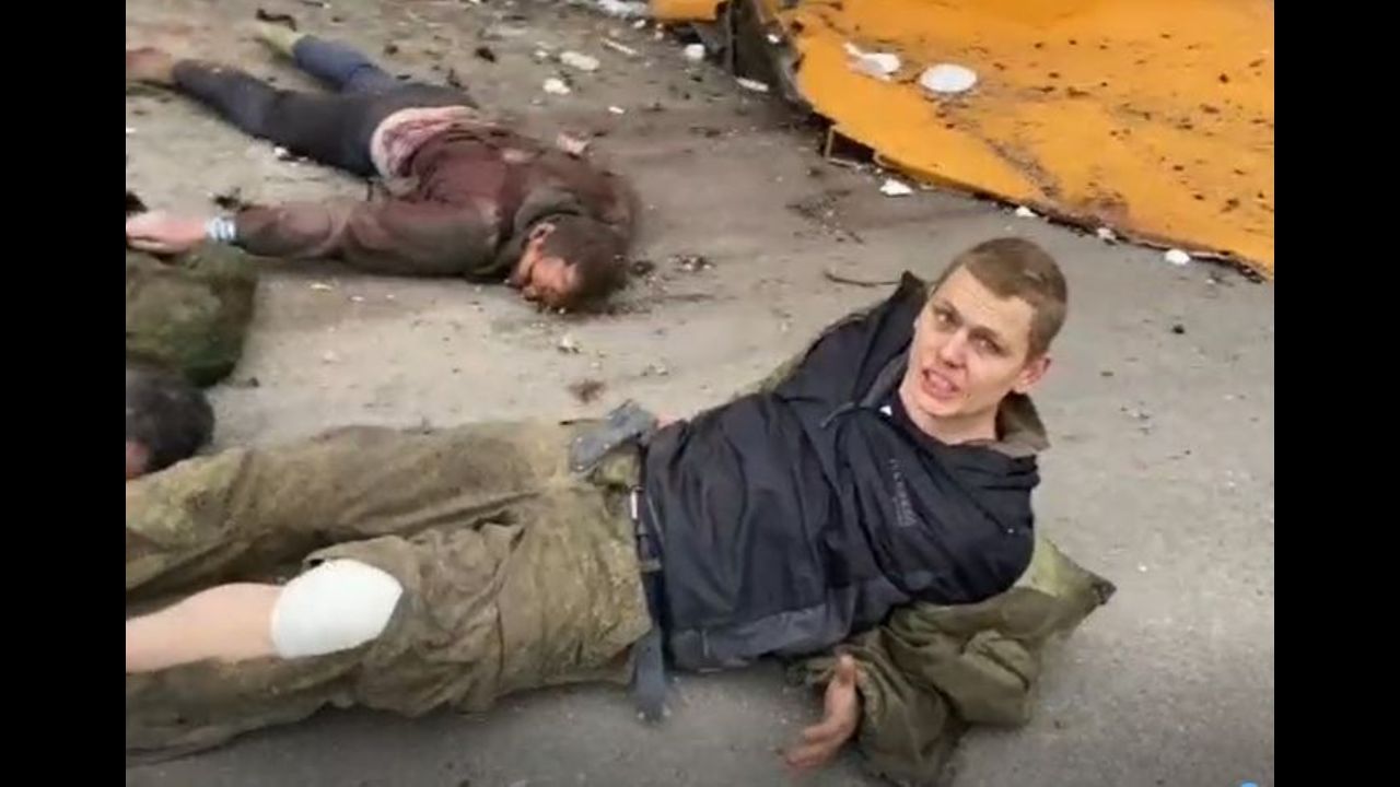 A Russian POW it's dragged on the floor like a corpse and laid besides two Russian corpses. The man recording loads his rifle. The Russian POW begs in terror.