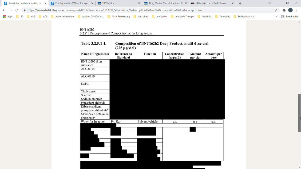 There appear to be up to 7 fully redacted ingredients in Pfizer's experimental genetic vaccine BNT162b2. In this video, I discuss a heavily redacted excerpt of Section 3.2.P.1 from a confidential Pfizer document, released by the MHRA in response to my Freedom of Information request.