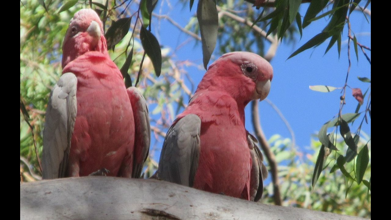 A hot afternoon in the Guildford area, close to the Swan River, and the bees are coming out of their tree trunk hives to cool the interior down, and the pink and grey galahs are holding their wings out to cool down.