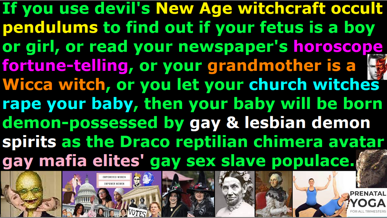 *** Intelligence news update from the Human Homo-Sapiens Race Survival Resistance (HRSR) headquarters and Republic Rebel Alliance battlefront (March 2023). This is a warning to all pregnant mothers. If you use the devil's New Age witchcraft occult pendulums to find out if your fetus is a boy or girl, or of if you read your newspaper's horoscope fortune-telling section, or if your grandmother is a Wicca witch, or if you let your church witches rape your baby in the church women’s group or get raped by your reptilian hybrid pedophile cannibal Satanist pastor, or you conduct pregnant women’s prenatal yoga exercise demon-summoning (each yoga posture summons a certain demon spirit), then your baby will be born demon-possessed by gay homosexual & lesbian demon spirits as the Draco reptilian chimera avatar gay mafia elites' gay sex slave populace. These Draco reptilian chimera fake alien incarnate avatar people know psychically who the gay & lesbian humans are with LGBTPB demon spirits inside them, so they will approach them in the bars and schools and work and restaurants and parties. The sexual appetite of these demons are not humans, but they are perverse, because they are not God’s creation, but they are manufactured nephilim & chimera fake aliens, as well as fallen angel fake aliens. They will astral molest your human specie’s children while they sleep, and they will suck your penis and finger your vagina and dig your anus to your second and third and fourth generation children and grandchildren and great grandchildren, if you mess with the occult realm of Satan Lucifer. When the Western feminist nations rebel against women’s head coverings so that their heads are controlled by the LGBTPB (lesbian gay bisexual lesbian pedophile bestiality) fallen angels to ridicule God, and they cross-dress in men’s pants to blaspheme God’s Creation, and they kick out the men from the family and raise the children as single mothers, then the Western feminist nations apostate harlot Church that has over 50% divorce rate and whose women behave like men, will be judged like Sodom & Gomorrah was by sword & famine & plague & demon armies. When the 1960s generation get taken over by the accursed hippy rebellion generation’s demons then witchcraft rebellion New Age occult demons come in next; then it is only a matter of time until Jezebel feminism demons and narcotics witchcraft demons come in; and then, pedophile cannibal Satanist abortion child sacrifice demons and LGBTPB gay & lesbian demons come in; and then, demons in cloned hybrid human-looking avatar bodies and stolen “walk in” bodies of servant human occult necromancy spirit guide “alien contactee” “ascended master contactee” spirit channeling New Age witch feminists come in to take over every key position in society, in order to carry out extermination of the Western feminist nations’ “Bible verses redefining women’s head coverings rebelling fallen angel head controlled” “Satan Lucifer’s post-1960s cross-dress-project men’s pants wearing” “unbiblical post-1873 10% salary illegal tithe income tax stealing” pastors and religious Christian hordes. All their politicians and church pastors and court judges and school teachers and Hollywood celebrities and nursery staff and military leaders and police officers and pediatricians and CIA NSA MI6 FBI agents and idol singers and college professors will get replaced by nephilim & chimera & fallen angel incarnate avatar LGBTPB (lesbian gay bisexual transvestite pedophile bestiality) demon spirit incarnate avatars. You have been warned.