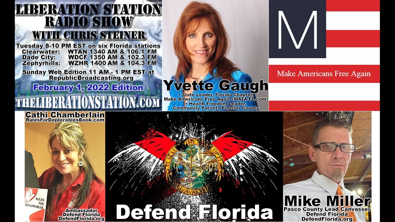 ► Cathi Chamberlain and Mike Miller with Defend Florida (DefendFlorida .org) on Florida election integrity and their upcoming press conference at the Hillsborough County Supervisor of Election’s Office, February 3, 2022 at 11 AM (DefendFlorida.org/media and facebook.com/events/454560552839256), plus on Saturday, February 5, 2022, 9 AM - 6 PM Defend Florida, presents “Defend 2022: What Patriots CAN DO to secure Florida’s 2022 Election” (DefendFlorida.org/2022).