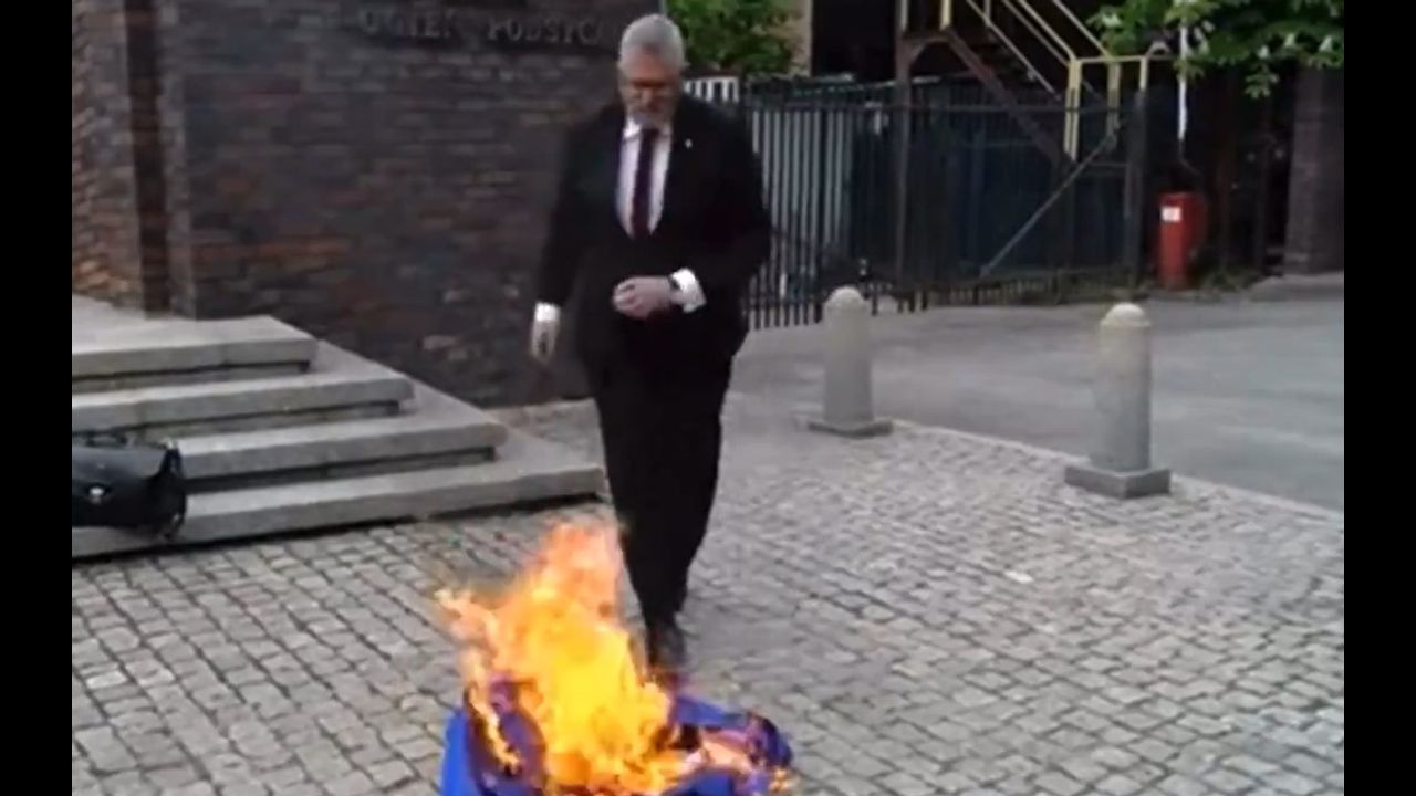 Polish presidential candidate stomps on EU flag and then burns it