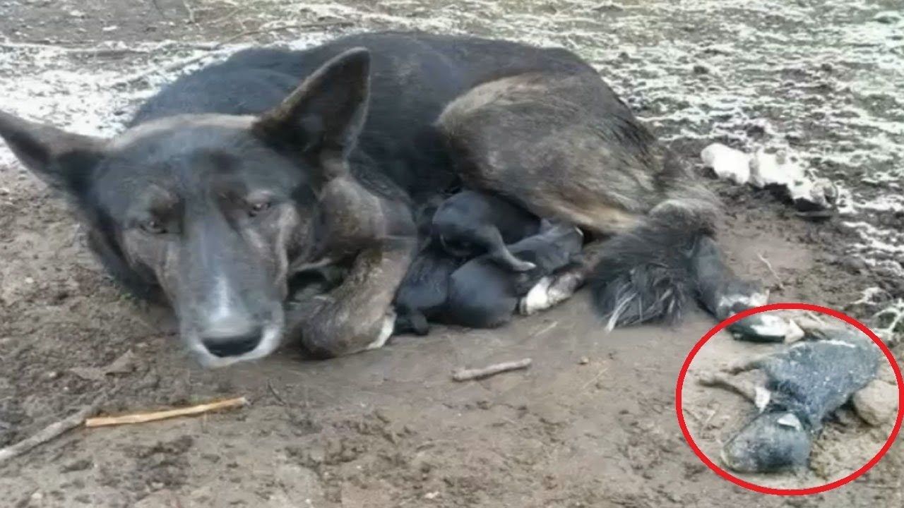 The skinny and hungry mother and her puppies were rummaging through the trash to find something to eat.