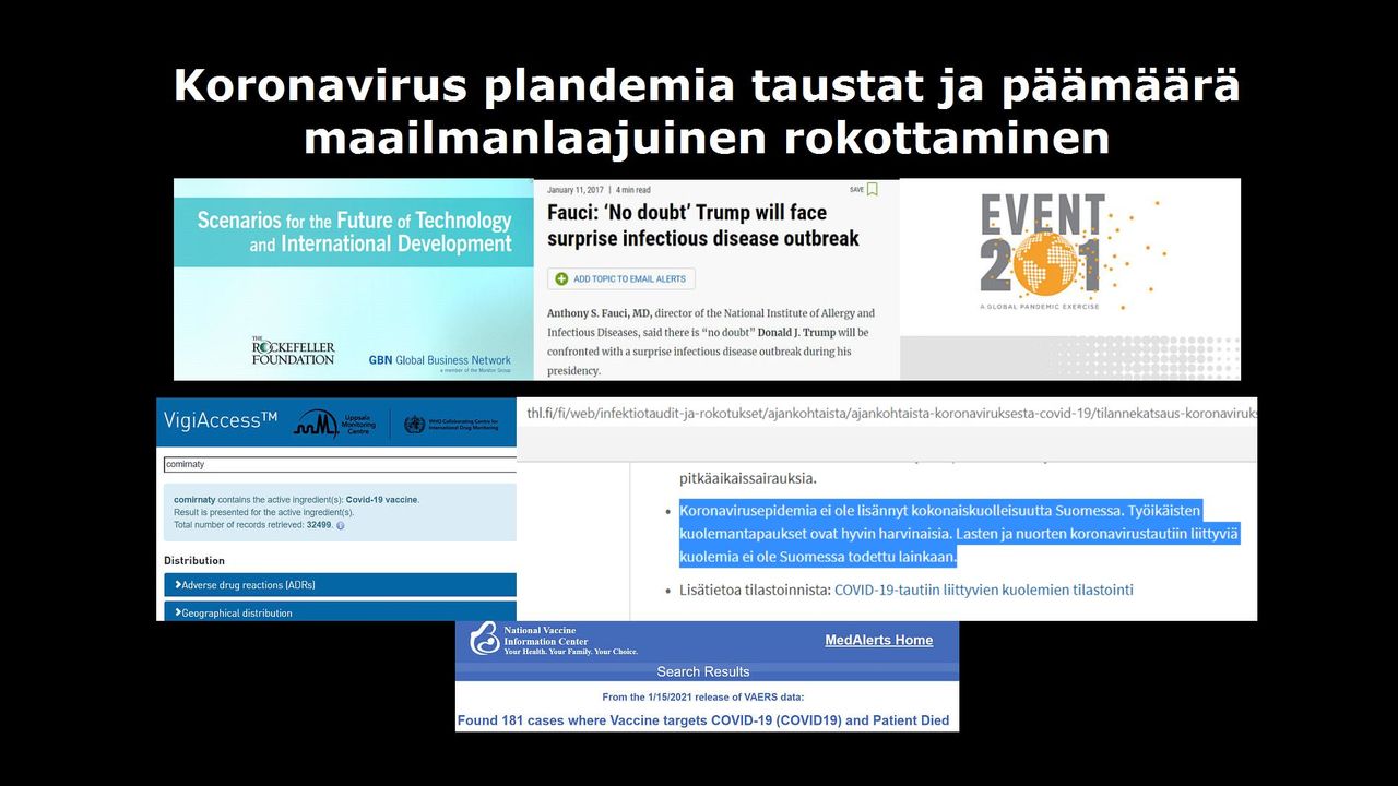 Koronavirus plandemia tausta ja päämäärä maailmanlaajuinen rokottaminen ja uusi maailma. Virallinen C0VID narratiivi on etukäteen suunniteltu. C0VID rokotteiden haittavaikutukset aiheuttavat sairauksia ja kuolemaa. C0VID tartunta ja kuolinlukujen tilastointi perustuu epätarkkaan tilastointiin. Tartuntoja ja kuolinlukuja liioitellaan. Pelon kautta ihmisiä hallitaan ja ohjataan ottamaan rokote. C0VID rokote on astinlauta uuteen maailmaan, missä ihminen kytketään yhteyteen digitaalisen tietomaailman kanssa.