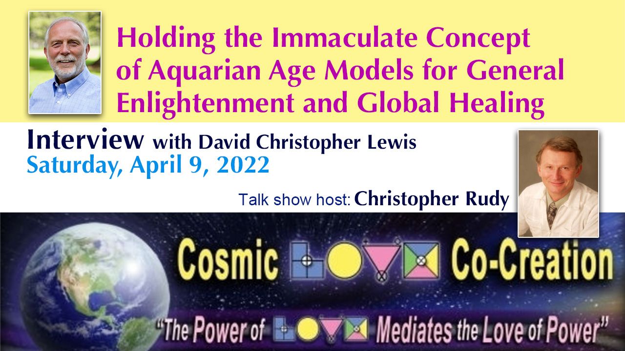 https://www.heartscenter.org - Talk show host Christopher Rudy interviews David Christopher Lewis, author and spiritual teacher on the Cosmic Love Show. Their topic of discussion is Holding the Immaculate Concept of Aquarian Age Models for General Enlightenment and Global Healing, and they cover many illuminating, inspiring, and thought-provoking topics. David is the co-founder of the Hearts Center community which has a very active internet platform broadcasting free of charge to hundreds of people daily. David receives up-to-date, cutting-edge messages from the ascended masters for today's conditions and spiritual requirements. David and Christopher discuss the newest publication of the Hearts Center, Mother Mary's Messages: Holiness, Healing and Hope for the New Age, and many issues of current interest.