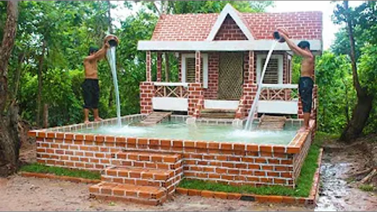 Buildding Amazing Pretty Brick Swimming Pool And Modern Two Story House Villa Design In Forest
