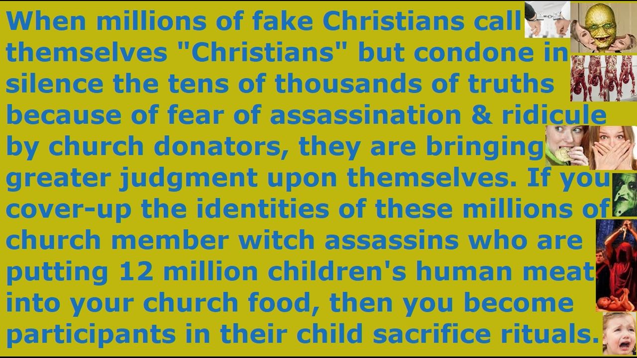 *** Intelligence news update from the Human Homo-Sapiens Race Survival Resistance (HRSR) headquarters and Republic Rebel Alliance battlefront (March 2025). When these millions of “naked women’s heads, men’s pants cross-dressers androgynous transgender” fake Christians cover-up the identities of these church member witch assassins, who are putting children’s meat in their church food, they themselves become accomplices in crime and participants in the child sacrifice ritual themselves. They are the scum of the world, who blaspheme God by calling themselves “Christians” in front of the heathens & heaven & earth. They do not seem to realize what they are doing, and that they are bringing greater judgment upon themselves when they call themselves Christians and go to church. That is true foolishness, although they think they are intelligent & normal & godly, while they think we real Christians & Jesus are blind & poor & naked & evil & lukewarm. Everything is inverted in a Satanist world, just like their inverted cross symbol. These millions of cowardly traitor fake Christians hate our real Christians’ sermons and do nothing, or even worse, they bring greater judgment upon themselves by speaking modified & diluted & sterilized & picked & chosen & edited half-truths to sabotage the truth and mislead millions of people to hell, while they love their fake unbiblical job position pastors’ sweet religious comedy sermons and pay billions of dollars of illegal tithe income tax to them to buy 12 million more children to torture & lesbian rape (peg) & satanically sacrifice & eat and throw their leftover human meat & bone ashes into their church food & supermarket groceries & restaurant food. The Western feminist nations’ churches are like rotten milk, and all their Christian ministries are owned by Draco avatar pedophile cannibal Satanist witches also, because Satan Lucifer & his fallen angels give their Draco avatar feminist witches both wealth & fame & popularity & high positions & churches, in exchange for feeding them the human meat & children’s adrenochrome blood soul energy & children’s soul energy from their torture’s pain & terror & sorrow & fear & shock, just like the blood & soul energy from their millions of abortion child sacrifice ritual live mutilation dismemberment. When these millions of fake Christians eat these 12 million children in their church food, and cover-up the identities of the church member witch assassins who are placing their children in their food, and give them human authority permission to do all these things by their condoning in silence, then they become accomplices in crime with Satan Lucifer and they would be considered active participants in these child sacrifice rituals. These millions of Western feminist nations’ “Bible verses redefining, uncovered women's heads rebels, fallen angel head controlled, men’s pants cross-dressers androgynous transgender” fake Christians and millions of Nicolaitan clergy class laity class Satanist pagan religious system's "ordained & allowed & trained & non-assassination-attempts-receiving" fake unbiblical job position pastors refuse to expose the tens of thousands of truths we real Christians shared to them, because they are afraid of getting cooked alive by CIA microwave oven weapons from next door homes & every hotel room every day. It is only their millions of fake Christians who delete entire chunks of the truth we shared to them, in order to hide in cowardice from assassination attempts and ridicule from church donators. The fake Church and true Church act in opposite ways, because they serve two opposite gods. Jesus died on the cross to atone for your sins, and he rose again, and he is seated on his throne in heaven reigning, so that whoever repents and receives him as Savior & Lord will receive forgiveness for sins and the gift of eternal life.