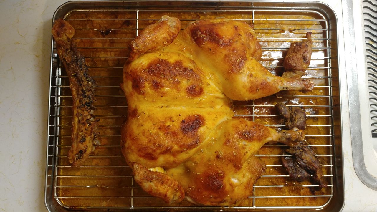 This Is a fun way to roast a chicken . Make sure that you have some really sharp kitchen shears and you can use a variety of marinades and spices on the chicken and it always comes out good .