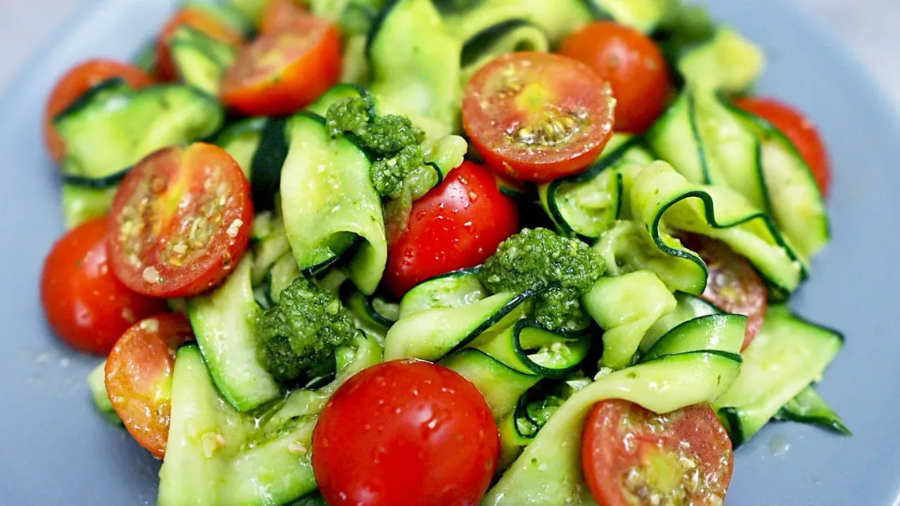 Light zucchini tomato salad with pesto sauce
