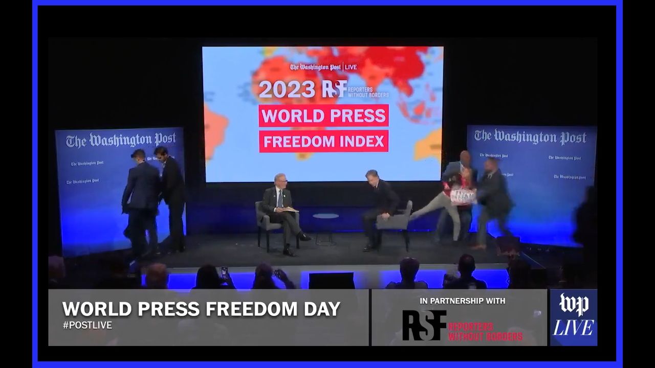 Members of @codepink storm the stage as Sec. Of State Blinken speaks, demanding Julian Assange be freed. THIS is what the spirit of free press looks like.