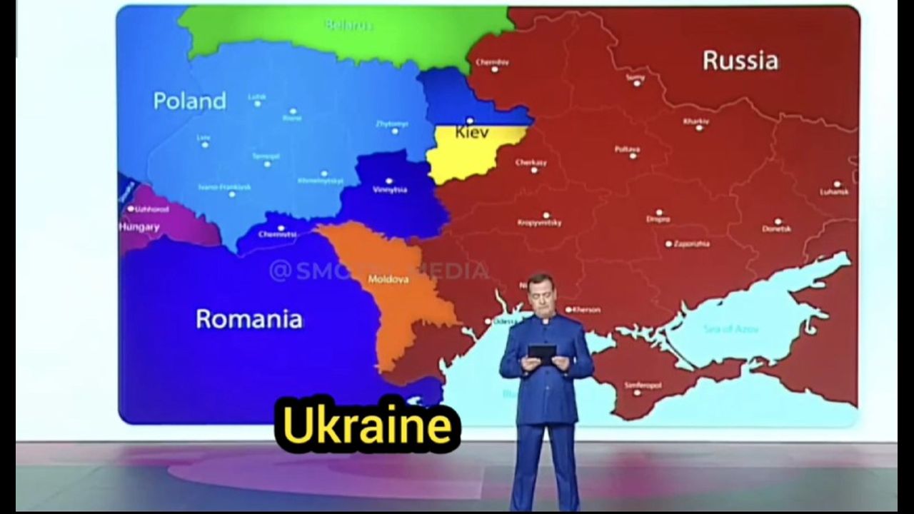 ❗️EPIC: Medvevdev (former President of Russia) just unveiled a new map of Ukraine split between Poland, Russia and Romania declaring: