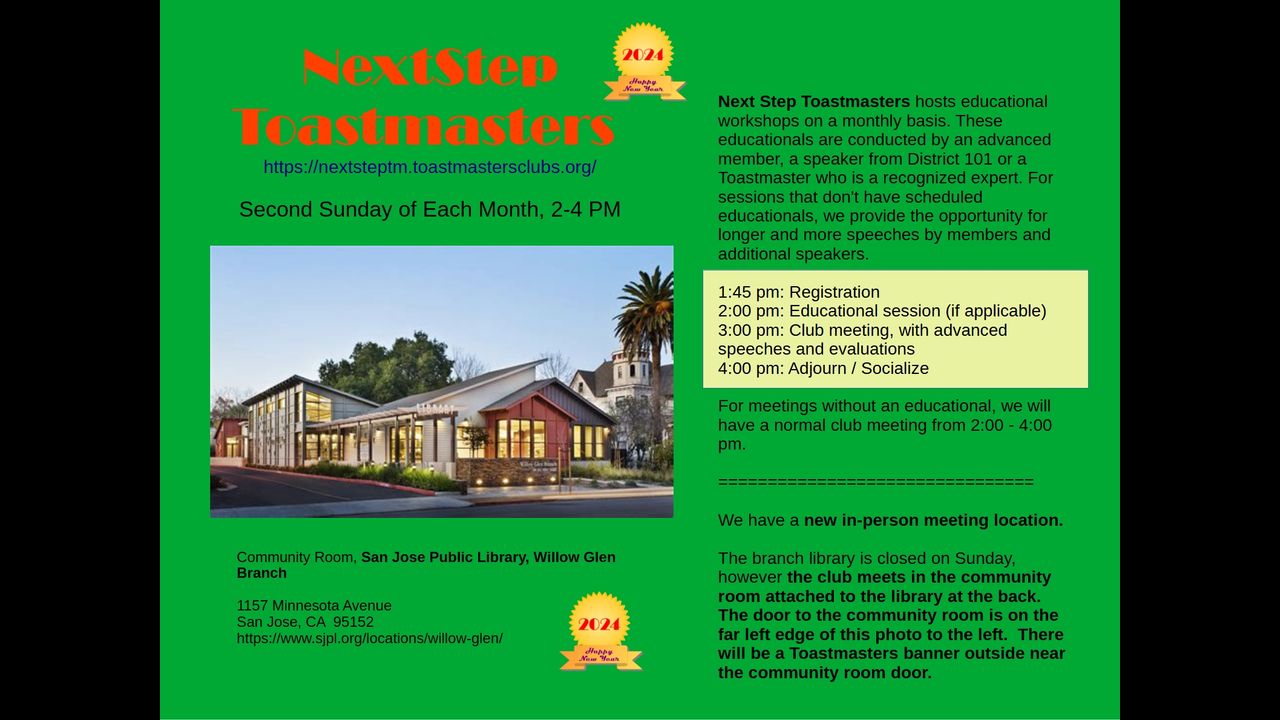 Next Step Toastmasters meets the Second Sunday of Each Month in the Silicon Valley, CA, USA