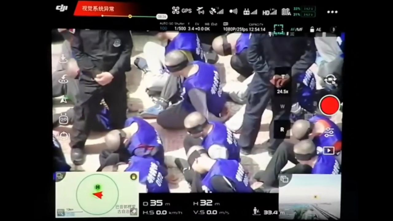 Drone footage of Chinese officials taking Muslim prisoners to a concentration camp