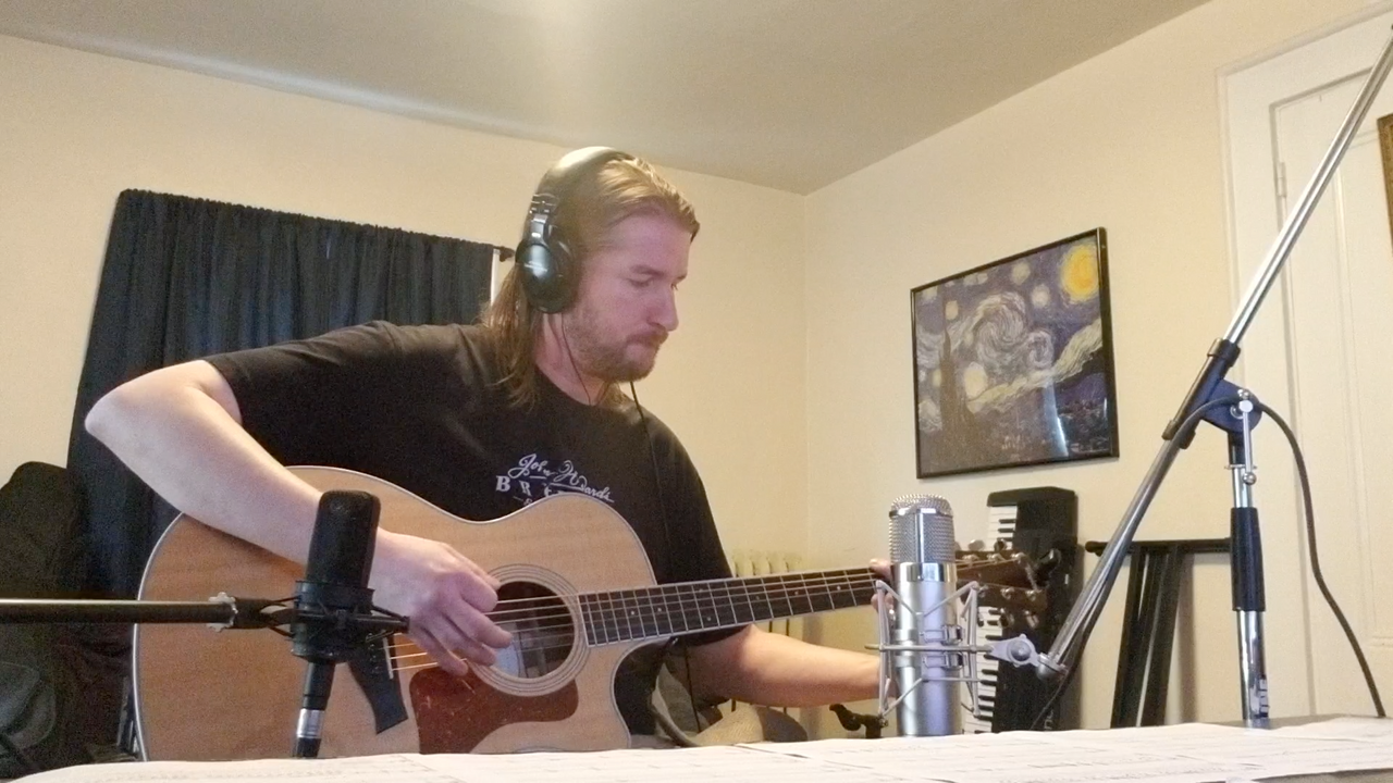 This is me recording the acoustic rhythm guitar track for my song "Horny Robot". Synced with the final audio but left some of the camera's microphone in as well. My friend Steve let me borrow a really nice microphone and I recorded this in my living room / home recording studio setup. October 13, 2018.