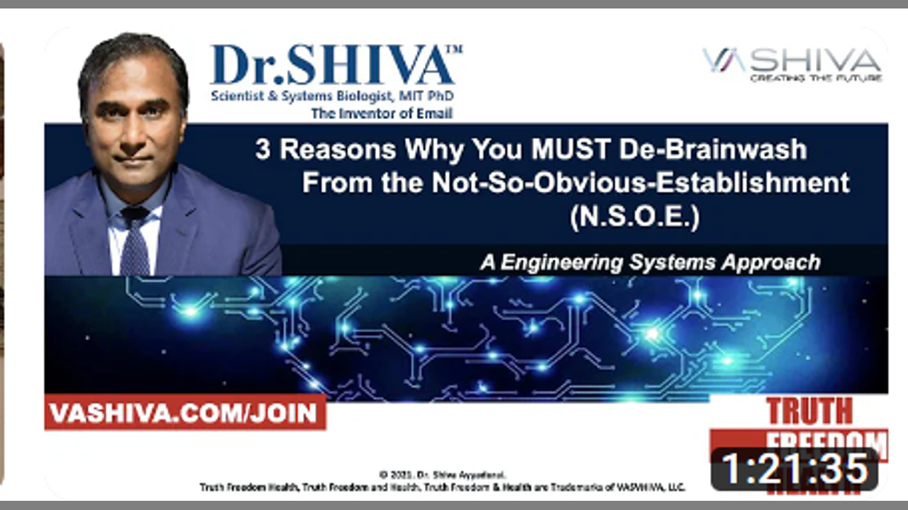 Dr.SHIVA LIVE: 3 Reasons To De-Brainwash From the Not-So-Obvious-Establishment (NSOE). Dr. Shiva Ayyadurai in this discussion shares why you must without compromise de-brainwash yourself from the Not-So-Obvious-Establishment. Dr.SHIVA Ayyadurai, MIT PhD, the Inventor of Email, world-renowned engineer, scientist, educator, entrepreneur, activist, and author, is a Fulbright Scholar, Westinghouse Science Honors Awardee, Nominee for the National Medal of Technology and Innovation, who has published in major peer-reviewed journals such as IEEE, Nature Neuroscience, CELL's Biophysical Journal. Dr.SHIVA is dedicated to educating world on the Science of Systems that is Beyond Black & White, Beyond Left and Right, so Working People Unite for Truth Freedom Health. Only a Systems Science Approach can provide a comprehensive method to understand connections among the parts of any system to elicit the science of all systems to reveal these three principles: 1) interconnection of Truth Freedom Heath; 2) why a bottom's up decentralized movement is necessary win #TruthFreedomHealth; and, 3) the insidious not-so-obvious-establishment which is the eternal disturbance to winning #TruthFreedomHealth. Learn the Foundations of System. Sign up at TruthFreedomHealth.com to become a #TruthFreedomHealth Warrior-Scholar. Get Educated or Be Enslaved! Become a Truth Freedom Health Warrior! TruthFreedomHealth.com