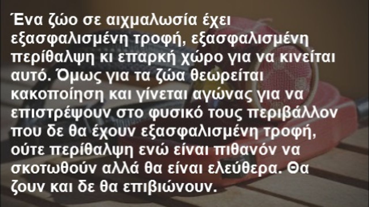 Ένα ζώο σε αιχμαλωσία έχει εξασφαλισμένη τροφή, εξασφαλισμένη περίθαλψη κι επαρκή χώρο για να κινείται αυτό. Όμως για τα ζώα θεωρείται κακοποίηση και γίνεται αγώνας για να επιστρέψουν στο φυσικό τους περιβάλλον που δε θα έχουν εξασφαλισμένη τροφή, ούτε περίθαλψη ενώ είναι πιθανόν να σκοτωθούν αλλά θα είναι ελεύθερα. Θα ζουν και δε θα επιβιώνουν.