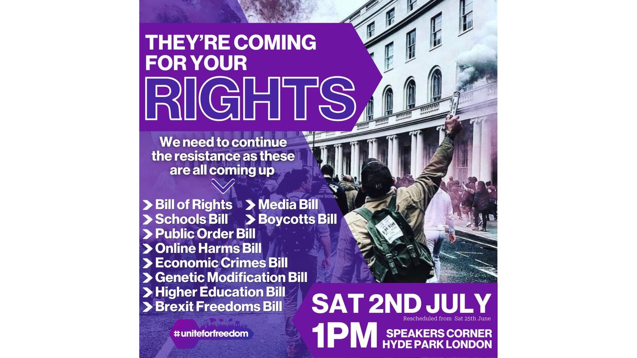 This one opposing ten new bills coming up to take away human rights in the UK Government's Operation Overreach - the Bill of Rights that seeks to remove the whole of the Human Rights Act, also the Media Bill, Schools Bill, Boycotts Bill, Public Order Bill, Online Harms Bill, Economic Crimes Bill, Genetic Modification Bill, Higher Education Bill, Brexit Freedoms Bill.