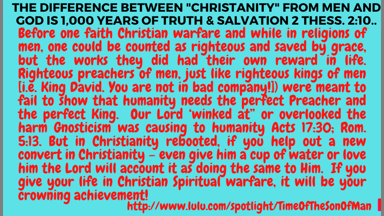 Rev. 14. THE DIFFERENCE BETWEEN MEN'S "CHRISTIANITY" AND THE LORD'S IS 1,000 YEARS OF TRUTH 2 THESS. 2:10!