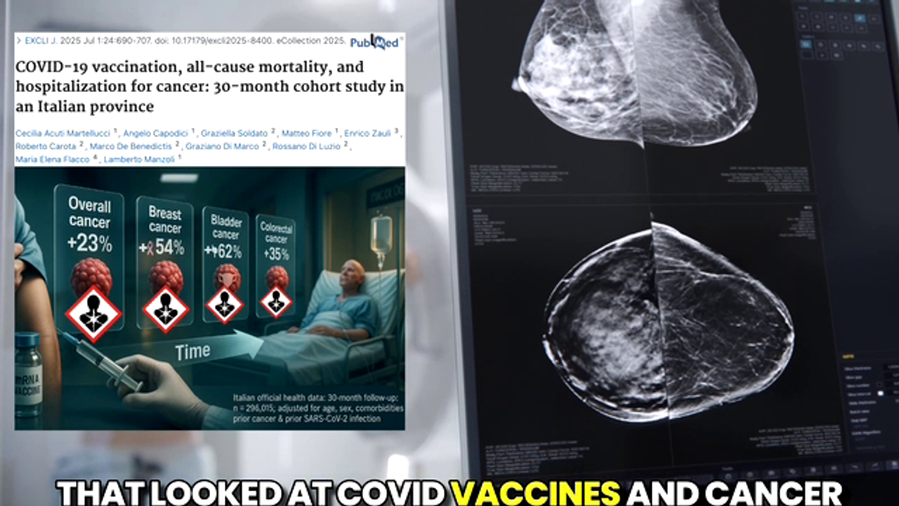 Nearly 300,000 people tracked for 30 months — mRNA “vaccines” increased risk of any cancer (+23%), breast (+54%), bladder (+62%) & colorectal cancer (+35%).