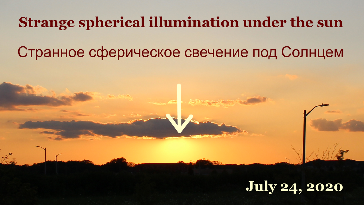 This is time lapse of the sunset I recorded from Canada around 8:30pm-8:45pm on July 24th 2020. It's the second time during this summer that I noticed strange spherical illumination UNDER the disc of the Sun (the Sun at that moment was still hiding behind the cloud and when it finally emerged the disc looked bigger than usually it looks at that height just above the horizon). During sunset our sky turns peach orange and right after the sunset there are lots of pink and purple clouds all over the sky - phenomenon that we observe with every sunset and sunrise now (since 2020 year in Canadian skies)