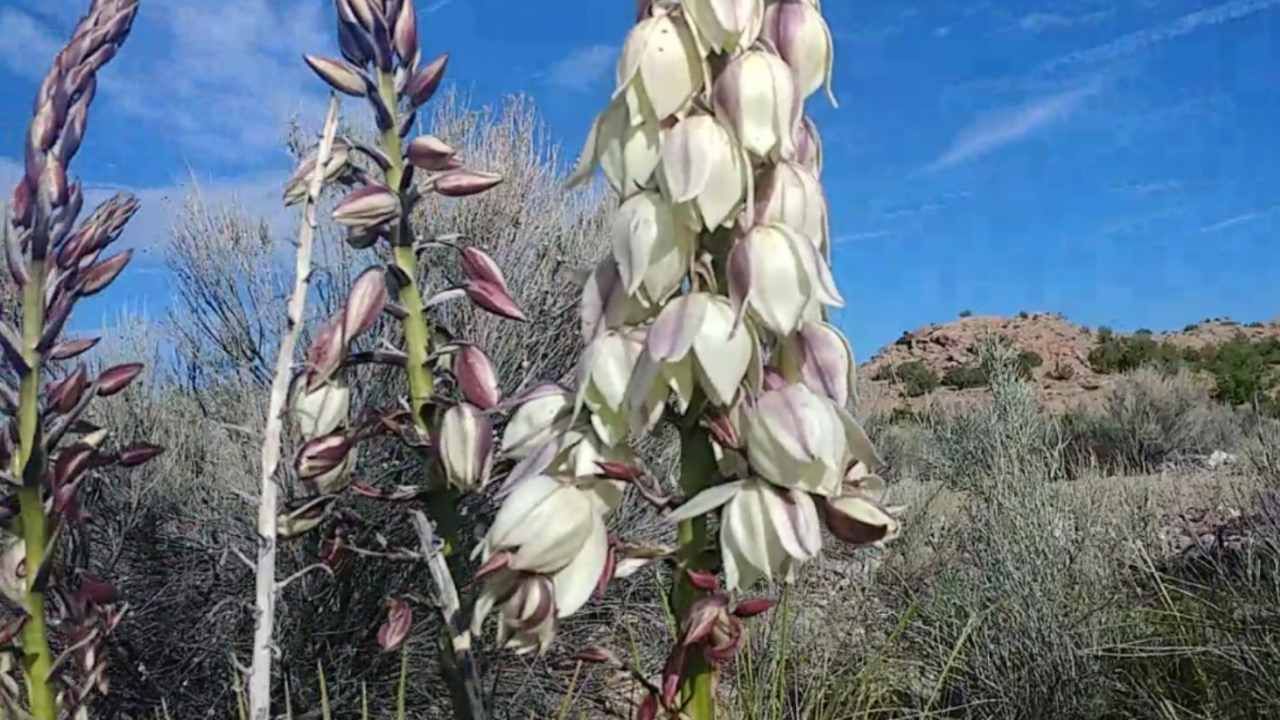 Yucca plants throw up a stalk when the conditions are right which looks like a giant asparagus and generates big flowers which eventually grow into edible fruit.