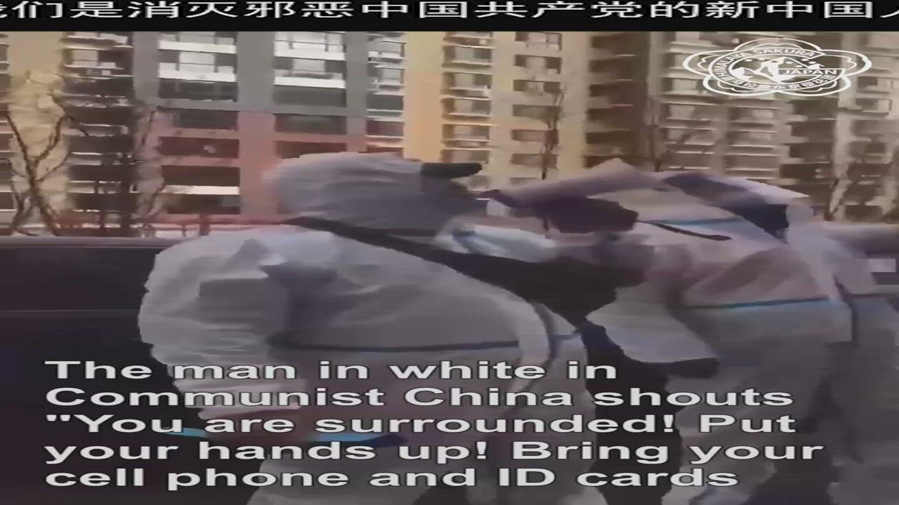 The man in white in Communist China shouts “You are surrounded! Put your hands up! Bring your cell phone and ID cards downstairs for Covid-19 test!”