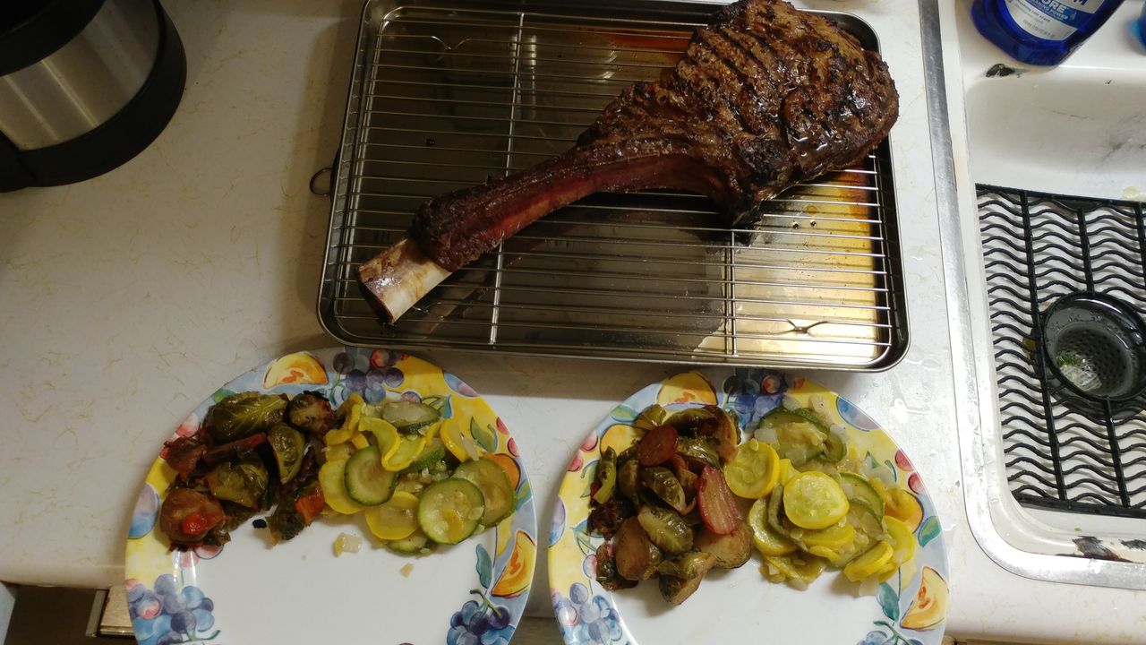 This is the preparation of a Tomahawk Steak, squash and onion and brussel sprouts.