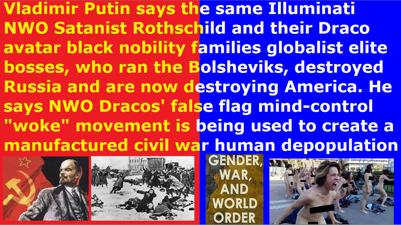 Vladimir Putin and the 16th ring planet Pleiadians are saying that the Draco reptilian chimera aliens’ “woke” Satanist Western values are creating crimes against humanity, and that the same Dracos who ran the Bolsheviks in Russia are destroying America today. For Russian Christian women, it is a shame to walk around without women’s head coverings, and they prefer to cover their heads. Therefore, unlike the “Jezebel spirit filled” America, Russia is not rampant with Draco reptilian chimera alien “gay mafia elite” LGBTPB (Lesbian Gay Bisexual Transvestite Pedophile Bestiality) orgy child sex magick Pedogate Pizzagate “White House Pizza Night” pedophile cannibal Satanist spirit cooking ritual naked feminist witches running around with placards screaming “women’s equality,” and all military officers above the rank of colonel being initiated into the Satanist Draco brotherhood by anal sodomy penetration initiation ceremony gang rape by the “pink brotherhood” of Nazi SS Schutzstaffel reptilian hybrid military generals, and Nazi President Donald Trump raping 12 year old children, and the current actual U.S. president Hillary Clinton high priestess witch who runs the Joe Biden clone running around lesbian raping and pulling out the intestines alive and sawing off the arms alive and gauging out the eyes alive and pulling out the brains with forceps through the nostrils alive of little girls to eat them, and End Times apostate harlot Church’s Satanist witch religious Christian freak horde women running around with their heads uncovered and pastoring the churches, and selling of hundreds of thousands of Baal Moloch abortion clinic child sacrifice temple live babies being sold for food & sex & rituals & experiments just as in ancient Sumerian Draco times, and all hell breaking loose in America and Australia and UK and Sweden and all other Western feminist nations that are under God’s judgment wrath by sword & famine & plague. It is amazing that Alex Jones is now admitting that Vladimir is right, when up to now he had been vilifying Russia and China and Iran to whom the U.S. presidents and their Draco bosses sold nuclear missiles to, in order to be used by Satan Lucifer to incite war between the humans for depopulation extermination as in every era. The U.S. presidents and leaders gave nuclear bombs to the Soviet Union and China and Iran. The real Christians’ sermons must be waking Alex Jones to the truth, so that means the real Christians getting cooked alive every day by CIA microwave oven weapons has not been totally in vain. I cannot say the same for all the cowardly traitor silent pastors and the millions of Western feminist nations’ religious Christian freak hordes who are shouting, “God bless America the global Illuminati genocide army headquarters,” and “vote child rapist Donald Trump another 4 years,” and “Support our troops and their genocide and narcotics industry and gang-stalking of real Christians.” However, the problem with Alex Jones is that he hides all the important critical vital truths, such as that the Pentagon Joint Chiefs of Staff tried to missile the White House and Capitol building to start a nuclear war, and Donald Trump tried to start nuclear war to stay in office and prematurely start the NWO, and the thousands of children raped and tortured and eaten in the torture chambers underneath the White House, and the need to pull down the Isis Statue of Liberty and Osiris phallic symbol Washington Monument and Isis vagina symbol White House oval office, and warning about the Nazi 5th Reich space fleet imperial clone army avatars in American military and Chinese military uniforms that are infiltrating America by the thousands, and all other information that needs to be shared and exposed and warned and shouted out now.