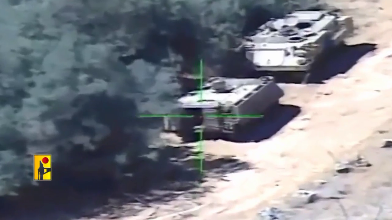 Hezbollah published a video showing the operation targeting an israeli APC vehicle in the vicinity of the Ruwaisat al-Alam site, with an Almas top-attack ATGM.