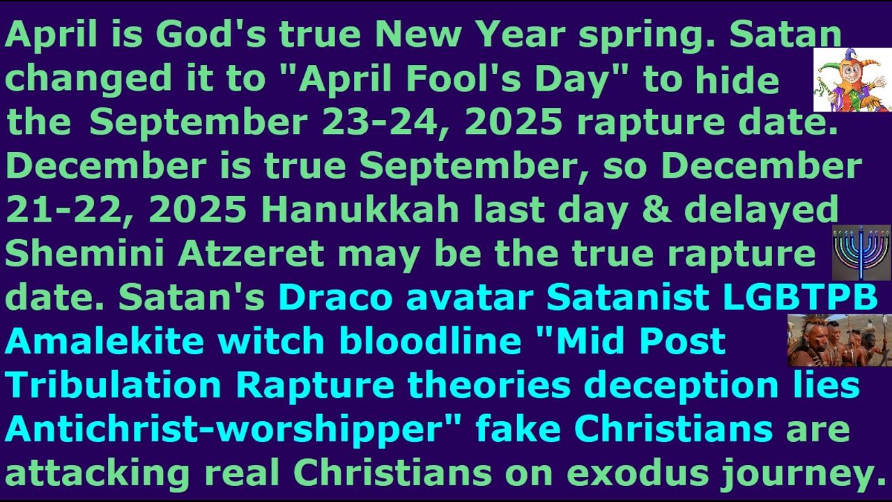 *** Intelligence news update from the Human Homo-Sapiens Race Survival Resistance (HRSR) and Republic Rebel Alliance battlefront (December 2025). April spring is God’s true New Year, which Satan Lucifer’s Draco reptilian chimera fake alien incarnate avatar pedophile cannibal Satanist 6,000 year old “earth’s hidden matriarchal rulers” “lesbian sisterhood coven witch feminist” LGBTPB (lesbian gay bisexual transvestite pedophile bestiality) orgy child sex magick spirit cooking ritual Pedogate Pizzagate “White House Pizza Night” “Mid Post Pan Pre-Wrath Tribulation Rapture Theories deception lies Antichrist-worship mockers & scoffers internet-trolls fake Christians” globalist elites changed to “April Fool’s Day” and made New Year into their fake January winter, so Joshua’s prophetic September 23-24, 2025 rapture date is possibly in December on the last day of Hanukkah and the delayed Shemini Atzeret on December 21-22, 2025, because Hanukkah is the “delayed Feast of Tabernacles Sukkot festival of lights”. Hanukkah is named after “Hanoch” or “Enoch” who was the first person to be raptured in history. Just like the Esau’s “Revelation 3 fake Jews Synagogue of Satan Illuminati NWO” Edomite Amalekite pagan witch Satanist bloodline Draco reptilian hybrid globalist elite “fallen angel spirit guides demon-possessed” “Mid Post Pan Pre-Wrath Tribulation Rapture Theories deception lies Antichrist-worshippers” internet-trolls mockers & scoffers fake Christians attacked Moses & the Israelites during their Exodus out of the world Egypt into the Promised Land, so also are the fallen angel demon-possessing them to attack all the real Christians who are waiting expectantly for the exodus rapture return of Jesus. These soulless demons are still doing the same old evil things even after thousands of years. These reptilian hybrid soulless raphaim dead disembodied nephilim demon spirit avatar Satanist fake Christian internet trolls are mocking & scoffing & accusing & internet trolling & ridiculing & attacking with witchcraft & attacking with job loss & attacking with demon spirits & attacking with thoughts of doubt unbelief hopelessness fear confusion despair anger giving-up-watching & sickness attacks & family attacks & black magick attacks & assassination attempts all the real Christians. They are blessing the End Times apostate lukewarm harlot Church’s fake Christians & fake unbiblical job position pastors with millions of dollars of church donations, and millions of church member idolaters, and peaceful comfortable lives, and wealthy Laodicea Church investments & savings & retirement pensions & homes, and happy families whose brains are not controlled to try to kill them as Jesus said would happen if they pick up the cross & follow Christ, and happy church lives that will lead them to hell, and safety from assassination attempts, and safety from ridicule by the 99% religious filth church donators, and normal religious heathen lives just like the heathens. The world will come down crashing down on them suddenly when we real Christian samurai warriors are removed from the earth at the rapture, who are restraining the judgment from coming upon them, and who are protecting them and protecting the millions of cowardly traitor fake Christians & every single pastor who betrayed us real Christians like family dogs, and threw us out to the Illuminati wolves, and abandoned us to fight alone by myself against God’s billions of enemies & assassins & world elites, because of their fear of assassination attempts & fear of ridicule from all their church donators.