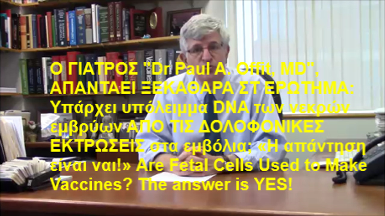 Υπάρχει υπόλειμμα DNA των νεκρών εμβρύων στα εμβόλια; Η ΑΠΑΝΤΗΣΗ ΕΙΝΑΙ ΝΑΙ! Are Fetal Cells Used to Make Vaccines? The answer is YES! From Dr Paul A. Offit, MD, The Children's Hospital of Philadelphia. ΠΗΓΗ ΤΟΥ ΒΙΝΤΕΟ: https://youtu.be/PhIvTBZzfsI THE SOURCE OF VIDEO.