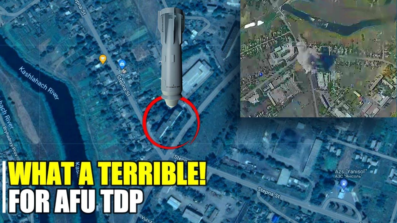 The shock and terrible power of a Russian FAB-1500 guided aerial bomb, completely hitting the temporary deployment point of the 58th Separate Mechanized Brigade of Armed Forces of Ukraine in Velykaya Novosyolka in south Donetsk. The powerful explosion of the 1.5-ton bomb and its large radius of destruction, devastated the area where the bulk of the Kiev regime forces were located!