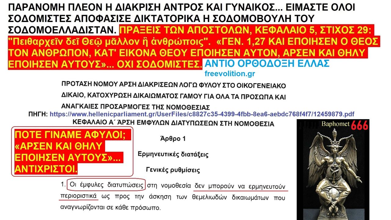ΠΑΡΑΝΟΜΗ ΠΛΕΟΝ Η ΔΙΑΚΡΙΣΗ ΑΝΤΡΟΣ ΚΑΙ ΓΥΝΑΙΚΟΣ... ΕΙΜΑΣΤΕ ΟΛΟΙ ΣΟΔΟΜΙΣΤΕΣ ΑΠΟΦΑΣΙΣΕ ΔΙΚΤΑΤΟΡΙΚΑ Η ΣΟΔΟΜΟΒΟΥΛΗ ΤΟΥ ΣΟΔΟΜΟΕΛΛΑΔΙΣΤΑΝ https://ugetube.com/watch/mcQQXU9UxtKsBTa , https://rumble.com/v49wqrl-the-greek-parliament-of-sodomists.html . ΠΡΑΞΕΙΣ ΤΩΝ ΑΠΟΣΤΟΛΩΝ, ΚΕΦΑΛΑΙΟ 5, ΣΤΙΧΟΣ 29: "Πειθαρχεῖν δεῖ Θεῷ μᾶλλον ἢ ἀνθρώποις". «ΓΕΝ. 1,27 ΚΑΙ ΕΠΟΙΗΣΕΝ Ο ΘΕΟΣ ΤΟΝ ΑΝΘΡΩΠΟΝ, ΚΑΤ' ΕΙΚΟΝΑ ΘΕΟΥ ΕΠΟΙΗΣΕΝ ΑΥΤΟΝ, ΑΡΣΕΝ ΚΑΙ ΘΗΛΥ ΕΠΟΙΗΣΕΝ ΑΥΤΟΥΣ»... ΟΧΙ ΣΟΔΟΜΙΣΤΕΣ.