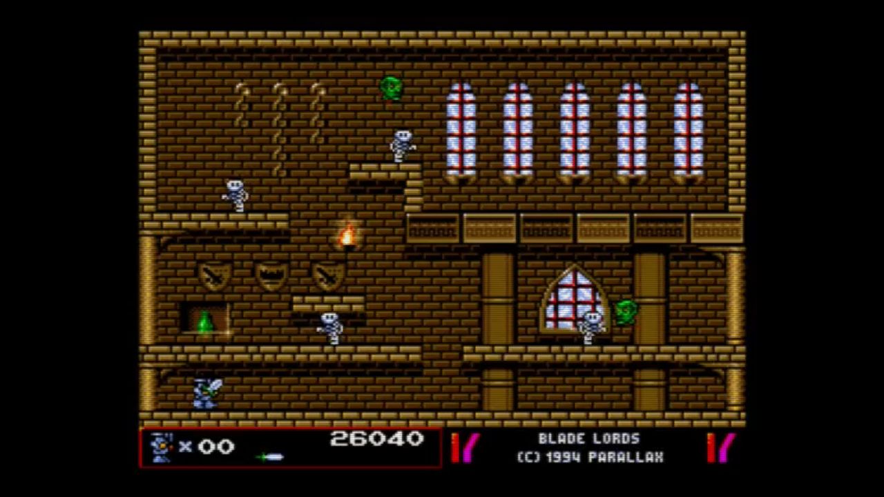 Blade Lords is an arcade platformer similar to Bubble Bobble or Mario Bros. in the sense that every stage consists of a single screen and that you have to kill all enemies on screen. The game can be played alone or in two-player coop. You control a knight wielding a sword.The sword can be thrown, making it fly in a straight, horizontal line, until it hits a wall or an enemy. The sword will fall to the ground then and can be picked up again. If an enemy gets hit by the sword, he will be paralyzed for a few seconds. If the knight jumps on a stunned enemy, he is destroyed. Non-stunned enemies are lethal to the touch. The knight can also use his sword to cling to the downside of a platform. If the platform is not too thick, the knight can swing himself upwards on the platform.