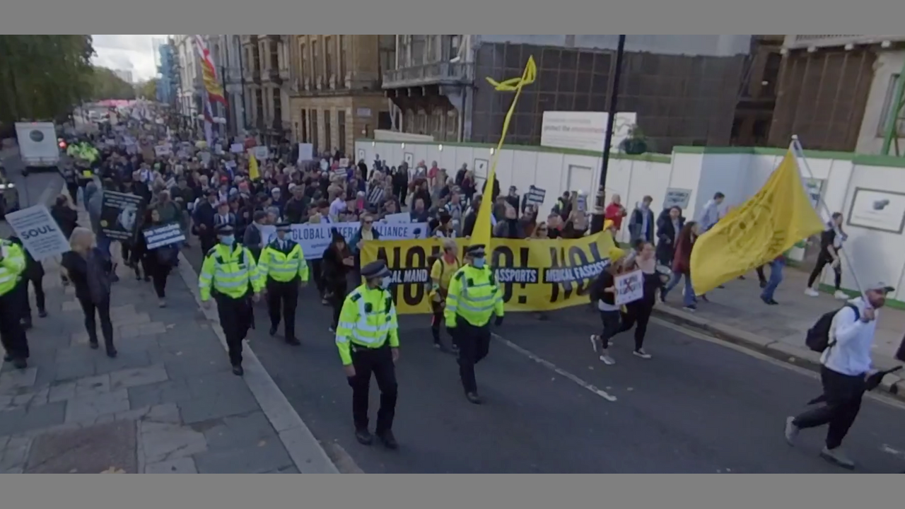 Demonstrators today in London just after starting their protest march from Hyde Park, protesting about the Vax Passport, jabs for children, Freedom of Speech and Freedom of choice.