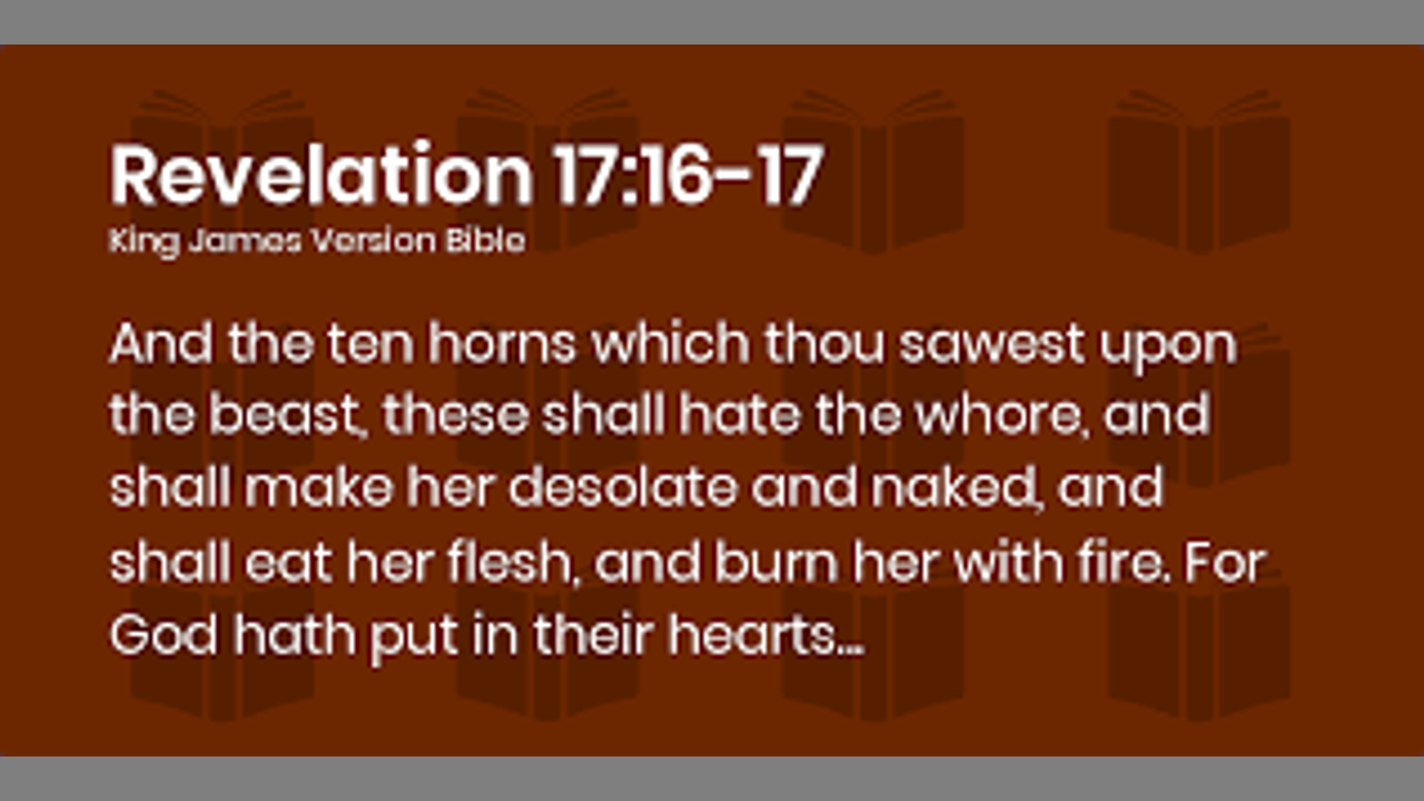 The beast and the ten horns you saw will hate the prostitute. They will bring her to ruined and leave her naked; they will eat her flesh and burn her with fire. For God has put it into their hearts to accomplish his purpose by agreeing to hand over to the beast their royal authority, until God’s words are fulfilled. Revelation 17:16-17