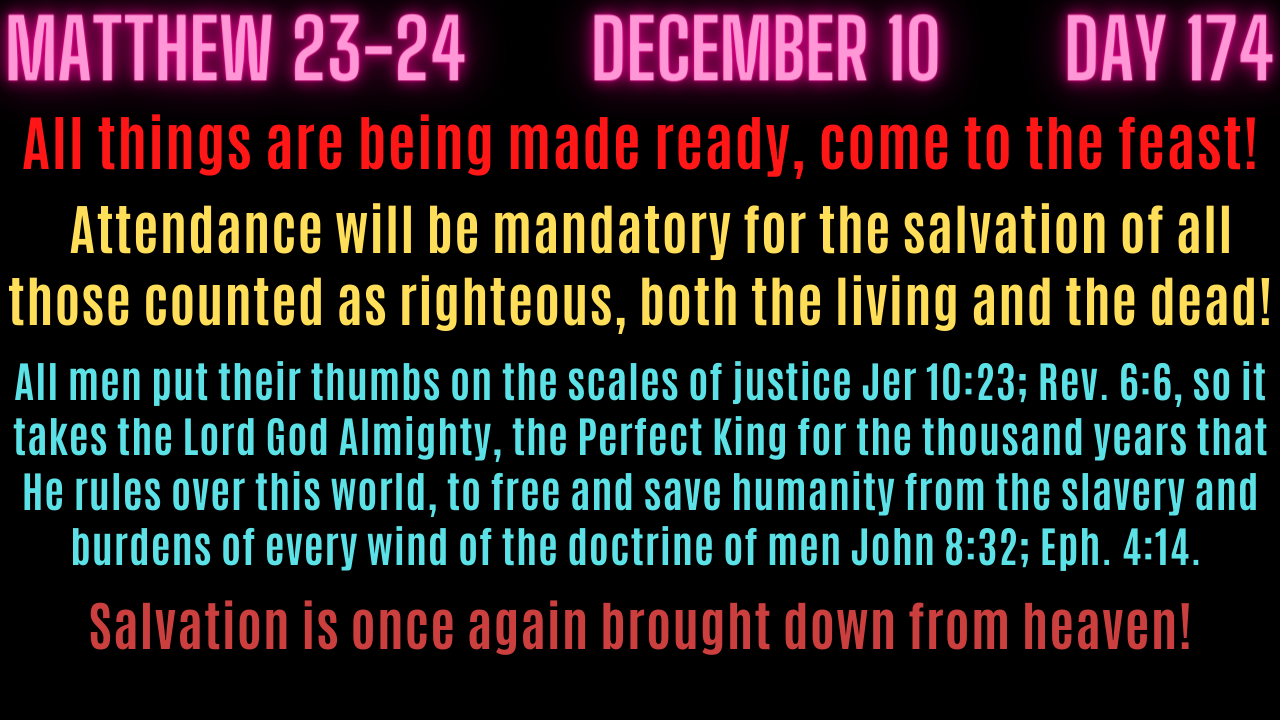 The Kingdom is like a wedding feast given by the Father for all of the righteous both living and dead- to celebrate the future marriage between the faithful and Christ for eternity! The celebration will last for 1,000 years broken up into two ages Eph. 2:7. These details of the feast have been hidden away by God for 1680 years – it is a part of the mysteries of the kingdom Matt. 13:11, or the hidden will of the Lord that is now revealed Eph. 1:9; 5:17. The Lord’s will is that for 6,000 years, after men were thrown out of the Garden of Eden Gen. 2:17, mankind would be under the subjective truth of men and that for 1,000 years salvation would be brought down from heaven in the Kingdom of God. Mankind has been in the spiritual dark ages/denominational apostasy 2 Thess. 2:3/a strong delusion 2 Thess. 2:11/under the subjective truth of men- the preaching of men. The Perfect Law of Liberty has been hidden away 1 Cor. 2:7 otherwise evil and ignorant men could never have stood up against God 1 Cor. 2:6-8. “Let God be true and every man a liar.” Rom. 3:4.