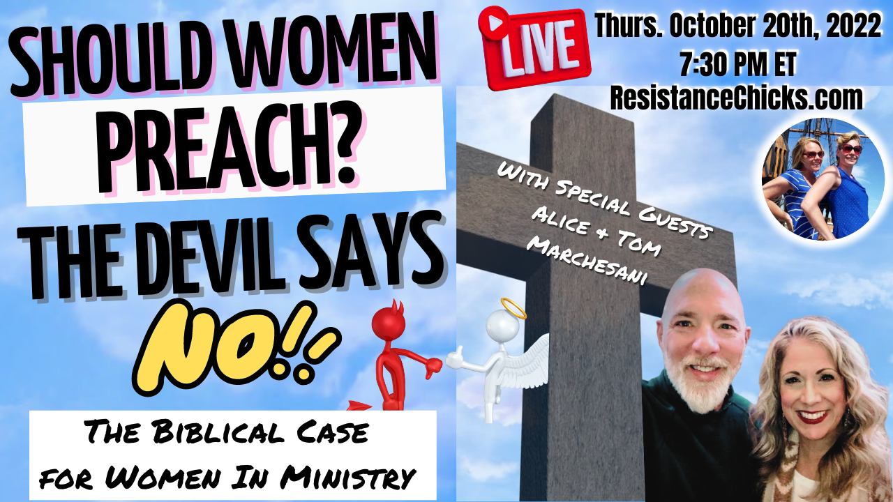 Should women preach the gospel and testimony of Jesus Christ? Of course! What an absurd question. However, there is a growing movement, especially in the American church, that interprets certain Biblical passages in a way that would silence women in their gifts and callings. "The root of this is doctrinal error is satanic for all of creation should sing God’s praises and preach His Words from the rising of the sun to the setting of the same." What does the Bible have to say about women in ministry? Many have strongly held convictions and beliefs- join us and our special guest, Alice and Tom Marchesani as we dig in to the nitty gritty and lay bare the heart of God on this HOT topic in the body of Christ today! Read More: https://www.resistancechicks.com/should-women-preach-the-devil-says-no/